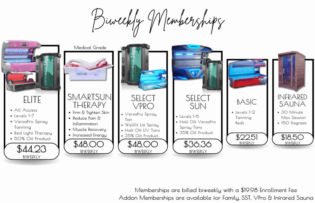 Our hassle-free memberships that auto-deduct from your account every month, so you can spend less time worrying and more time tanning. With 7 Levels of Tanning, VersaPro Spray Tanning, Red Light Therapy and Infrared Sauna there are unlimited options available for you!